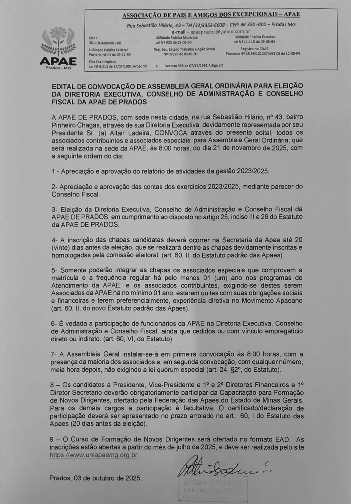 Documentos EDITAL DE CONVOCAÇÃO DE ASSEMBLEIA GERAL PARA ELEIÇÃO DA DIRETORIA EXECUTIVA, CONSELHO DE ADMINISTRAÇÃO E CONSELHO FISCAL DA APAE DE PRADOS Estatuto 2023 Ata de Posse